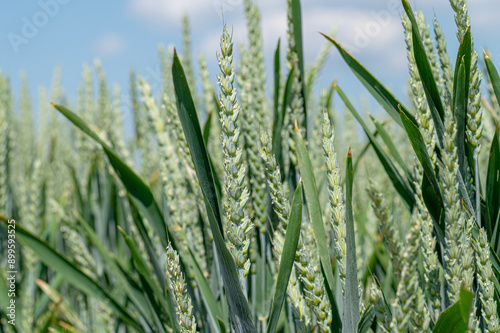 Fototapeta premium Weichweizen im Frühsommer, unreife grüne Ähren, aus der Nähe