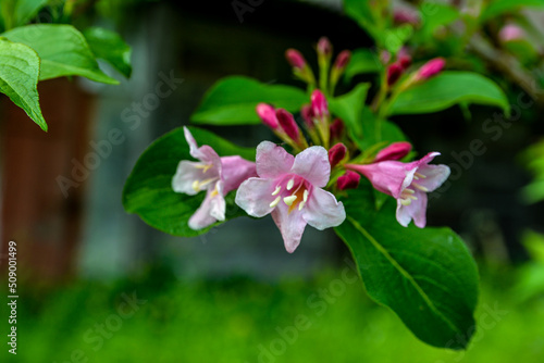 Fototapeta premium Weigela florida plant with flowers in full bloom in a garden.