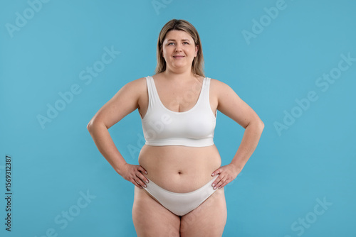 © New Africa, Naklejka premium Weight loss. Plus size woman in underwear on light blue background