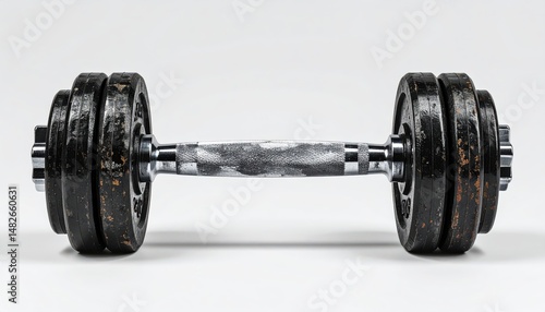 © Benxiumo, Naklejka premium Weight Training Instrument: A weathered dumbbell, its surface etched with the marks of rigorous workouts. An emblematic tool of strength and discipline, ready for the next rep.