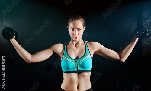 © peopleimages.com, Fototapeta premium Weight training, portrait or woman in gym with dumbbell, power or bicep curl in bodybuilding. Fitness, dark or athlete in studio with equipment, intense workout or strength exercise for muscle gain.