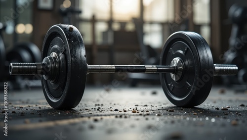 © TBC, Naklejka premium Weightlifting barbell on gym floor