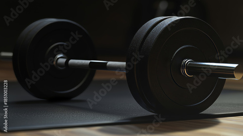 Fototapeta premium Weightlifting Set on a Black Mat Featuring Iron Weights, Representing...