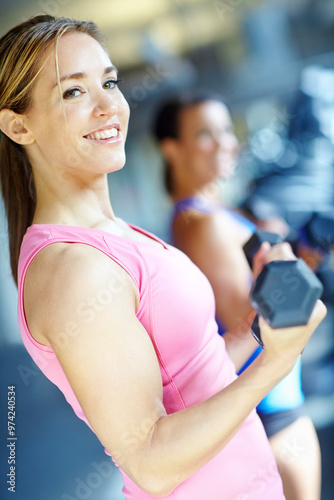 © ReeseBuyout3/peopleimages.com, Fototapeta premium Weights, happy and woman in gym for workout, bodybuilder training and exercise for health. Fitness, sports and person with weightlifting equipment for strength, muscles and wellness for strong arms