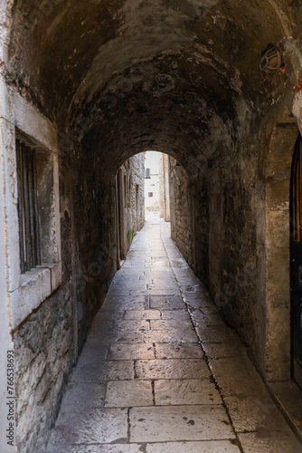 © carolindr18, Fototapeta premium Weihnachtlich geschmückte Gassen und Restaurants in der Altstadt von Split