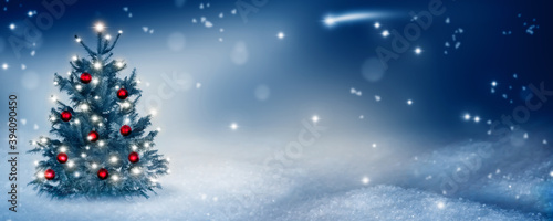 © winyu, Naklejka premium weihnachtliche idylle mit geschmücktem christbaum im schnee