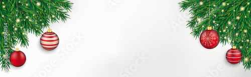 Obraz premium Weihnachtskarten Banner mit grünen Tannenzweige und roten Christbaumkugeln