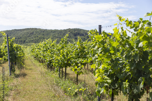 © tamaslaza3, Fototapeta premium Weinbaugebiet mit langer Weinlaube vor dem Rieseln gegen Schädling
