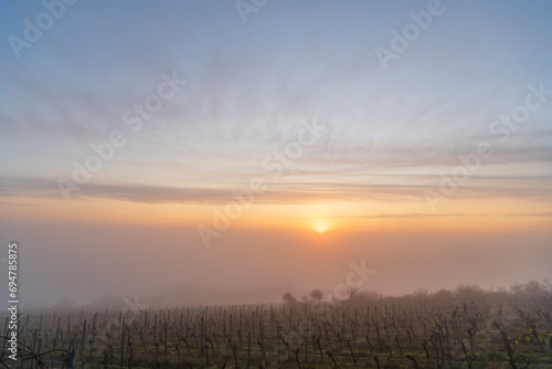 © Dirk, Obraz premium weinberg im nebel bei sonnenaufgang