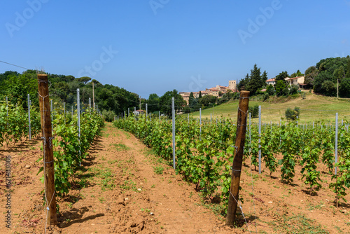 Fototapeta premium Weinberge bei Bibbona Italien im Sommer mit Bibbona im Hintergrund