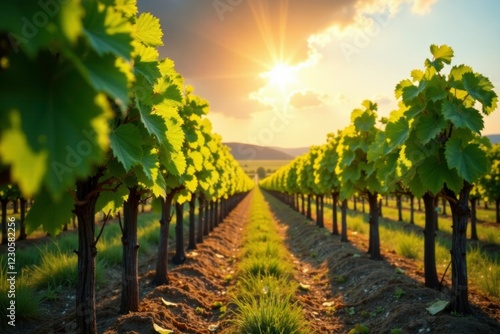 © anulak, Fototapeta premium Weintrauben reifen auf einem bunten Blatt unter einer Sonnenstrahlung, leaves, wine, landscape