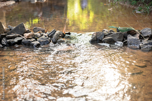 Fototapeta premium weir in river made from natural stone with people reflection on top