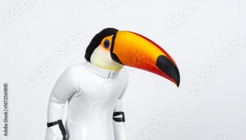 Naklejka premium Weird Conceptual Portrait of Toucan Head on a Human in White Suit on White Background