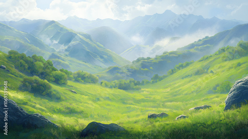 © Cedric, Fototapeta premium Weite grüne Landschaft mit Bergen und Nebel am Morgen