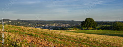 © Winfried, Obraz premium Weiter Blick über Felder zu Bergen mit Wald und Blick auf die Stadt