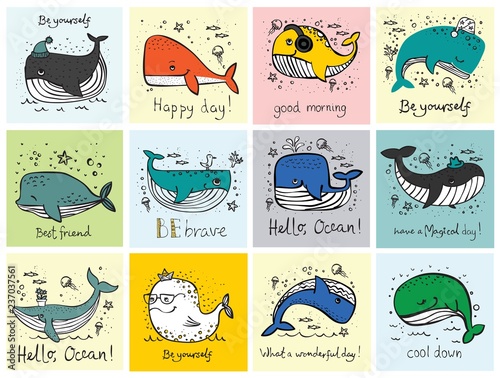 © virinaflora, Fototapeta premium Wektor ilustracja karty z cute doodle oceanów zamieszkujących wieloryby w kolorze i zabawny cytat motavation - wektor