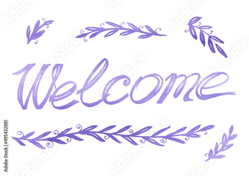 © Andrei, Fototapeta premium Welcome calligraphy lettering with decorative elements of branches. Violet color. Isolated. Motivation text. Hand drawn inspiration phrase