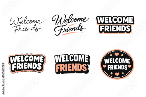 © 4zevar, Obraz premium Welcome friends sticker set with varied fonts and designs