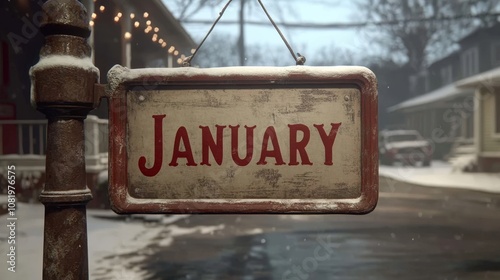 Obraz premium Welcome, January Snowy Neighborhood Scene with a Vintage Sign Announcing the New Year