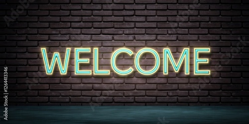 © ciaoaleandro, Fototapeta premium Welcome sign neon light on a brick wall background