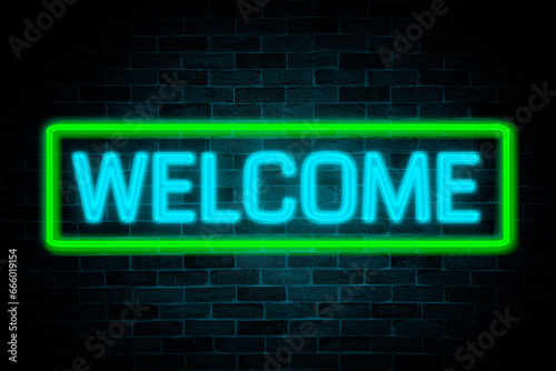 © Phubes, Fototapeta premium Welcome text neon banner on brick wall background.