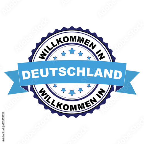 © pe3check, Fototapeta premium Welcome to Germany blue black rubber stamp illustration vector in german language - Willkommen in Deutschland on white background