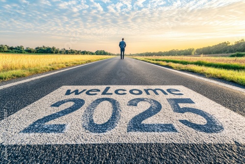 © MUdaylah, Obraz premium "welcome 2025" written on the asphalt road. Concept photo of the new year 2025. New year, new beginning. Standing on the road with generative ai