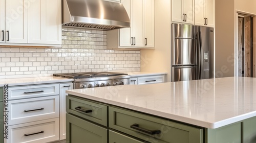 Fototapeta premium Welcoming kitchen design featuring white and sage green cabinetry a spacious island subway tile backsplash and sleek stainless steel appliances for modern living
