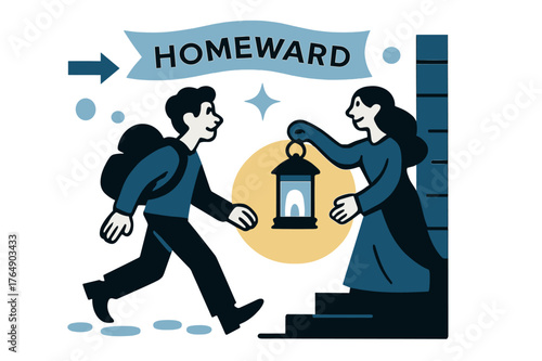 Obraz premium Welcoming Lantern Glow. Keeper of the Hearth ? Lantern on the Porch. A small lantern casts a welcoming circle; footprints approach through the dusk. Banner
