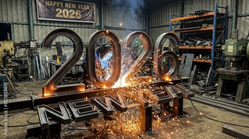 © flashmovie, Naklejka premium Welder in helmet and gloves sparks metalwork while cutting and assembling large 2026 numbers in a busy fabrication workshop, celebrating the new year with industrial skill