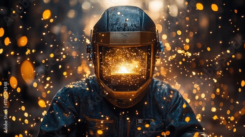 Fototapeta premium Welder in protective gear surrounded by glowing sparks, industrial work...