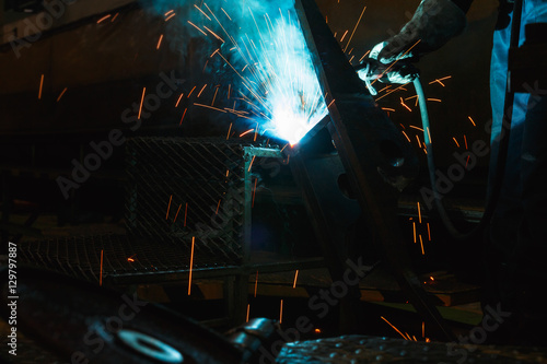 Fototapeta premium Welder of Metal Welding with sparks and smoke in manufacture
