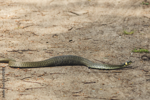 © Anna, Fototapeta premium Well fed european grass snake (Natrix natrix) trespassing the path, Kampinos, Poland