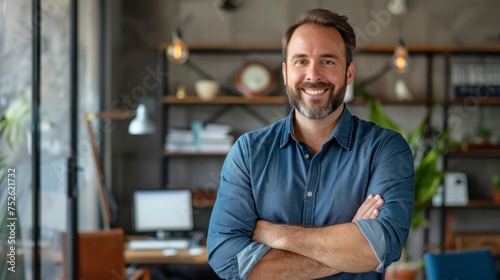 Fototapeta premium Well-groomed handsome man looking at the camera in a new, modern office with...