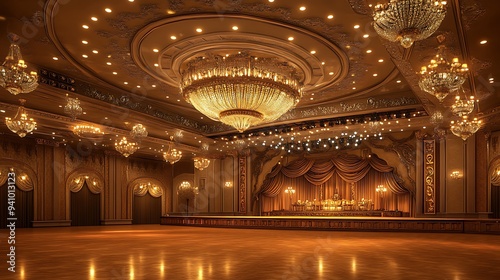 © Nasreen, Obraz premium Well-Lit Event Hall Featuring a Stage with Ornate Ceiling and Chandeliers