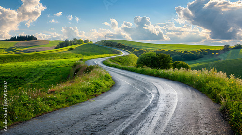 Naklejka premium Well-maintained rural road winding through picturesque countryside