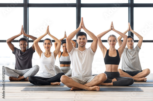 © Prostock-studio, Naklejka premium Wellbeing Concept. Happy multicultural people practicing group yoga in modern studio