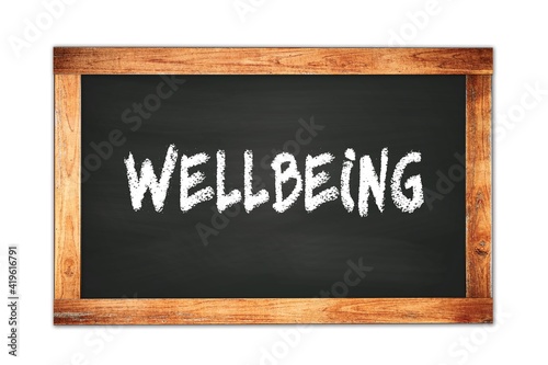Fototapeta premium WELLBEING text written on wooden frame school blackboard.