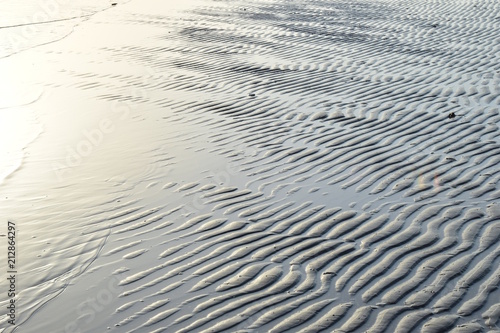 © Zeitgugga6897, Obraz premium Wellenförmiger Sand am Strand nach Ebbe am Morgen