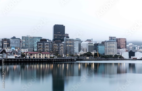 Naklejka premium Wellington city skyline in a misty evening