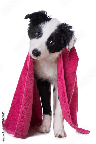 © DoraZett, Fototapeta premium Welpe mit Handtuch isoliert auf Weiß