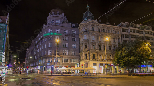 © HyperlapsePro, Naklejka premium Wenceslas Square in Prague at night timelapse hyperlapse, dusk time.