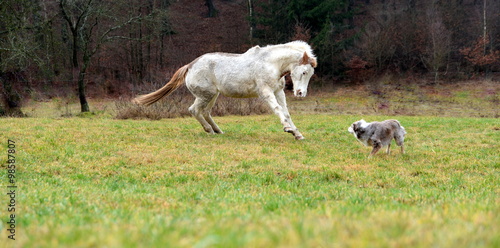 Obraz premium Wer treibt wen? Geschecktes Pferd jagt Hütehund