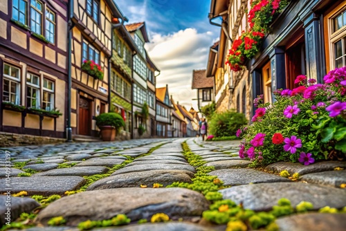 © Sandra, Fototapeta premium Wernigerode's cobblestone alleyway: macro photography unveils its hidden beauty.