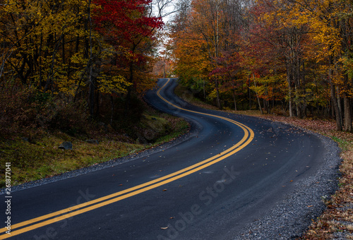 Fototapeta premium West Virginia curved asphalt road during peak fall colors with colorful tree and forest foliage.