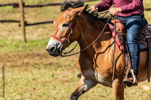 © Edward R, Fototapeta premium Western american white cowboy hat, dropped in sign of surrender and defeat. Italian horses and Rodeo show, role playing on sunny, summer day. Equestrian sports.