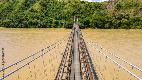 © Jhampier Giron, Obraz premium Western Bridge in Santa Fe de Antioquia, Colombia, spanning a muddy river with lush green hills in the background