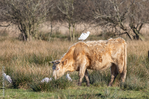 © Ian Dyball, Fototapeta premium Western Cattle Egret, Bubulcus ibis, on a cow, Norfolk UK