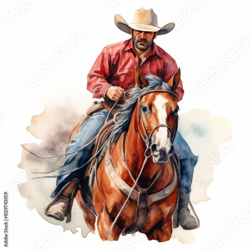 Fototapeta premium Western Cowboy Riding Horse Watercolor Illustration ? Detailed Art of a Man...