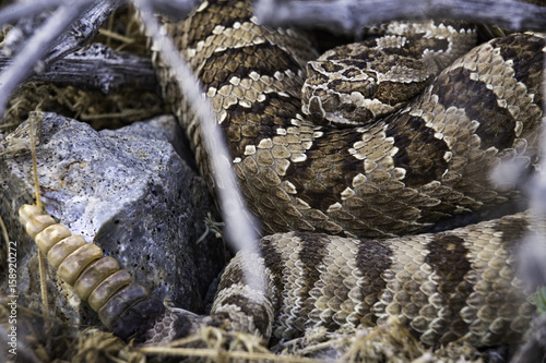 Obraz premium Western Diamondback Rattlesnake coiled in a bush next to a rock with rattle